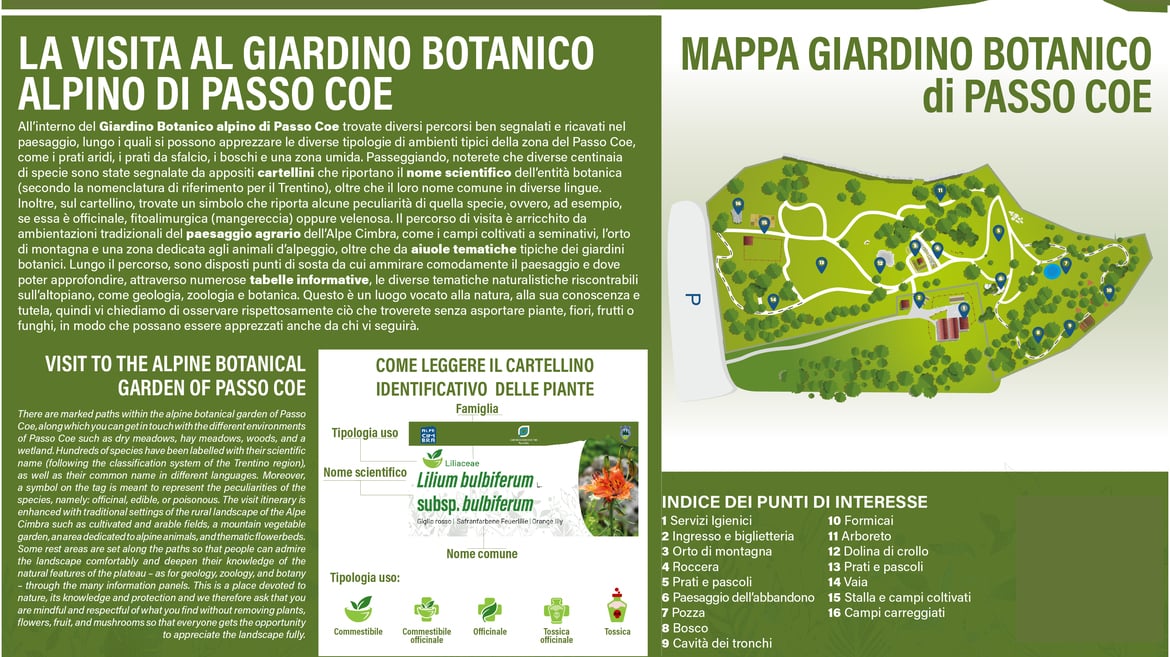 Der Alpine Botanische Garten am Passo Coe ist ein unverzichtbares Ziel für alle, die die authentische Natur des Trentino erleben möchten. Auf 1610 Metern Höhe auf der Alpe Cimbra gelegen, erstreckt sich dieser botanische Garten über 3 Hektar und beherbergt ausschließlich einheimische Alpenpflanzen. Er bietet ein intensives Naturerlebnis zwischen Weiden, alpinen Tümpeln, riesigen Ameisenhaufen und einzigartigen geomorphologischen Phänomenen wie Dolinen.