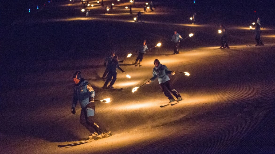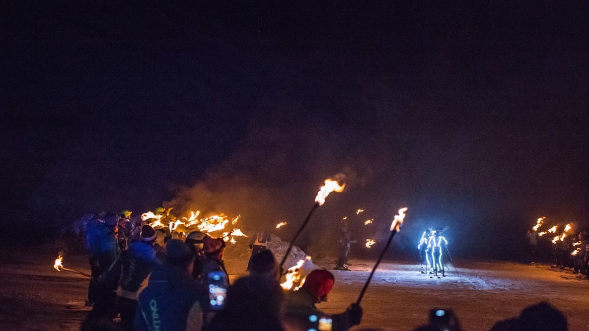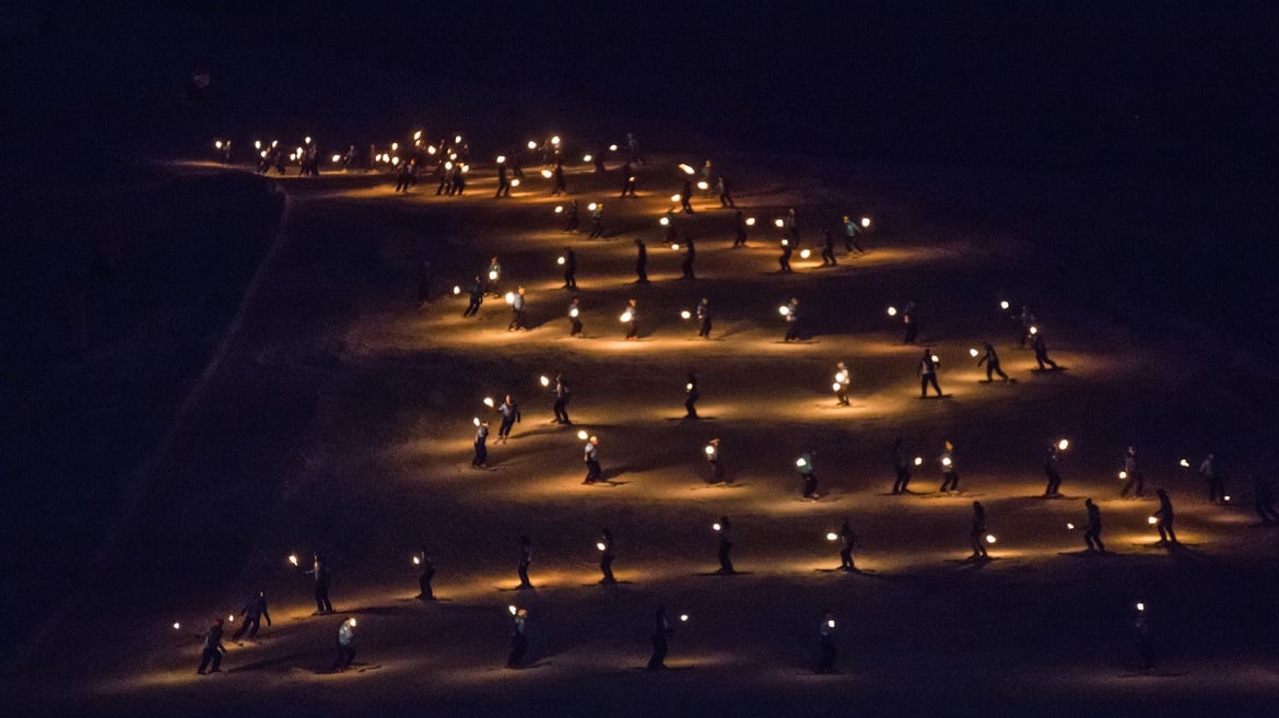 Skilehrer der Skischule Folgaria, ein einzigartiges Ereignis, das die Nacht in eine Bühne aus Licht und Leidenschaft verwandelt und die Wunder des Schnees sowie die Liebe zum Skifahren auf den schönen Pisten der Alpe Cimbra feiert!