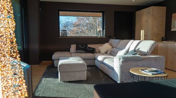 Glam Haus Apartment in the heart of Folgaria. New and well-maintained apartment with designer furnishings. 3 bedrooms (one double with en-suite bathroom and two twin bedrooms), two bathrooms, a spacious and bright living area surrounded by large windows, consisting of a living room with TV, dining area, and kitchen. Panoramic terrace with mountain views, furnished with a dining table and relaxing armchairs.