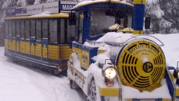 This is not a train running on rails but a fun wheeled train going around the streets of Alpe Cimbra.