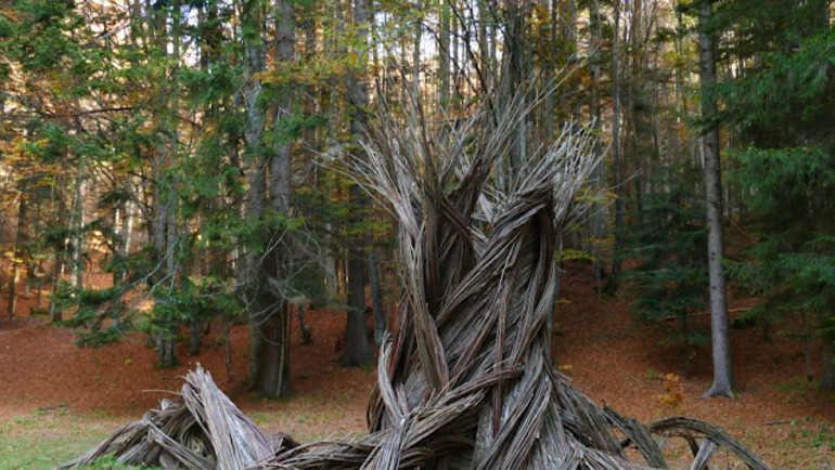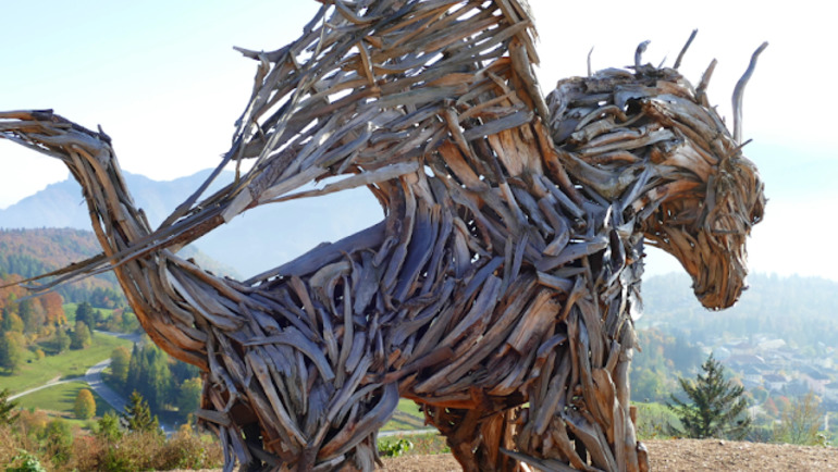 DRAGO DI VAIA Una volta nei pressi della baita, vado sempre dritto e seguo le indicazioni per il Drago di Vaia, una bellissima scultura costruita con gli alberi abbattuti dalla tempesta Vaia che tutti ormai conoscono. Siamo quasi alla fine della nostra escursione. Per un breve tratto seguo il percorso dell'andata, seguo poi le indicazioni per Gionghi e, poco prima del monumento a Fritz Jung, svolto a destra per la località Bertoldi. Una volta raggiunte le case del paese, continuo sulla strada asfaltata tenendo la destra e mi immetto nel Sentiero delle Sorgenti (indicazioni). Seguo poi a sinsitra la segnaletica per Lanzino, rientro di nuovo nel bosco all'altezza di Stengheli, raggiungo la strada provinciale e riprendo poco più avanti il sentiero sulla destra, fino a raggiungere il tracciato di questa mattina in direzione Respiro degli Alberi. Finisce dopo circa 5 ore questa bellissima camminata immersi nel foliage più bello del Trentino, tra faggi, panorami incantati e draghi.
