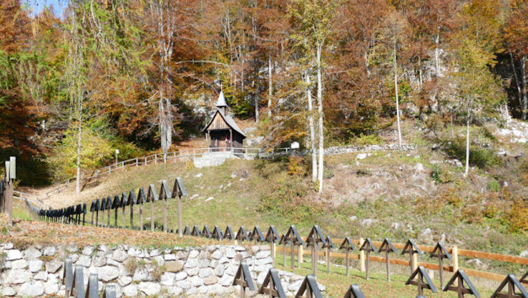 BAITA BELEM Ora bisogna seguire le indicazioni per Baita Belem. Su sentiero raggiungo in discesa una strada forestale, svolto a destra, passo per questa suggestiva baita e continuo sempre a scendere fino a trovare le indicazioni per Slaghenaufi e cimitero di guerra. Consiglio di abbandonare il sentiero e fare un visita al cimitero di guerra di Slaghenaufi (circa 10 minuti), un luogo molto suggestivo, carico di storia e di silenzi, dove sono sepolti oltre 750 soldati austro ungarici nel luogo in cui, durante la prima guerra mondiale, si trovava l'ospedale militare austroungarico. Ritorno di nuovo al punto di prima e cammino ora in direzione della baita Tana Incantata.