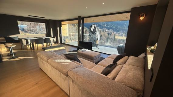 Appartamento Glam Haus nel cuore di Folgaria. Appartamento nuovo e curato, con arredi di design. 3 camere da letto (una matrimoniale con bagno, e due doppie), due bagni, ampio e luminoso living circondato da ampie vetrate composto da salotto con tv, zona pranzo e cucina. Terrazzo panoramico con vista sulle montagne con tavolo pranzo e poltrone relax. A disposizione: stoviglie, biancheria letto/bagno/cucina, lavastoviglie lavasciuga, phon, ferro da stiro, microonde. Deposito privato esclusivo per bici e sci, garage interrato con rampa riscaldata è dotato di colonnine di ricarica.