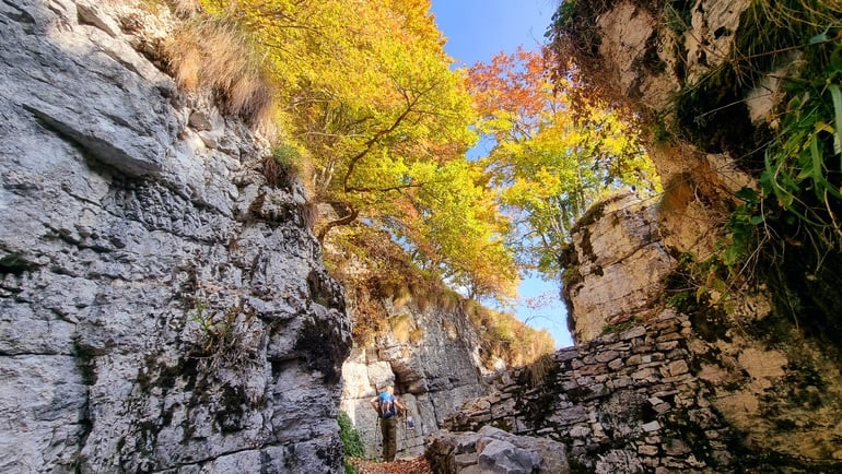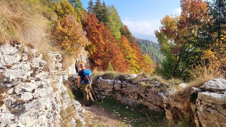 Klebostuo, Wolfsschucht, Forra del Lupo. Il primo è il nome in lingua cimbra, il secondo quello dato dall’esercito imperiale austro-ungarico durante la Grande Guerra, l’ultimo, più banalmente, è la traduzione italiana del toponimo tedesco, mentre “roccia fessurata” è il significato del termine cimbro. Siamo sul margine meridionale dell’altopiano di Folgaria, a due passi da Rovereto, tra Valsugana e Gruppo del Pasubio, e a picco sulla Valle di Terragnolo. La mia meta di oggi, in una giornata di metà autunno, è un magnifico e suggestivo percorso storico, che affonda le radici lontano nel tempo, e che venne poi ampliato e utilizzato dai soldati imperiali per controllare la valle sottostante e le pendici del Pasubio, dove erano attestati i militari italiani. Un itinerario storico, quindi, pregevolmente recuperato e risistemato dai locali gruppi dell’Associazione Nazionale Alpini e della Società Alpinisti Tridentini, che hanno anche posizionato, lungo il percorso, diversi pannelli con fotografie dei medesimi luoghi all’epoca del conflitto, in una sorta di viaggio nel tempo tra passato e presente.