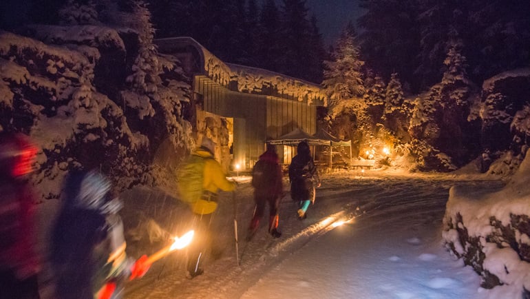 Si parte da Malga Millegrobbe nella terra degli ultimi cimbri rimasti, un buon calice di Trento DOC accompagnato dalla polenta na pult (polenta di patate) e uno sguardo alla luna calante, e poi via con cellulari accesi e frontalini che illuminano la via. Si sale in silenzio verso le trincee dove si è toccati lievemente dalla brezza e da qui si raggiunge la suggestiva Malga Millegrobbe di Sopra, dove ad attendervi un caldo piatto di orzotto trentino. Si prosegue la marcia nella “Tannebalt”: è un lungo serpentone, il fuoco acceso in punti sicuri indica la via e illuminata dalla luna si raggiunge la Baita del Neff sul Monte Virgo Maria. Qui il suono delle fisarmoniche accompagna un ottimo piatto di gulash, polenta e crauti. L’ultimo tratto abbracciati dal silenzio del bosco riporta a Malga Millegrobbe dove si conclude con l’immancabile torta cimbra al pino Mugo e una tazza fumante di the alla mela e cannella