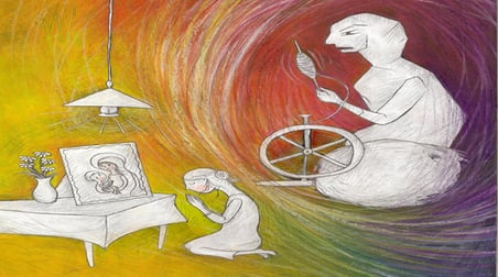 Allora risalì sulla montagna e ancora bussò forte, più e più volte. Ma ancora non ottenne risposta. La povera donna era decisa a rimanere sul posto, a bussare e ribussare finché la filatrice non le avesse finalmente aperto.