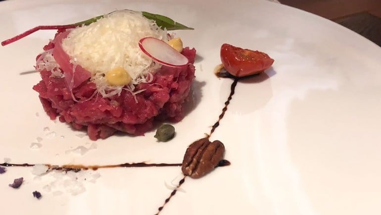 Tartare di manzo biologico trentino affumicata al tavolo e servita con uovo di quaglia e tartufo.