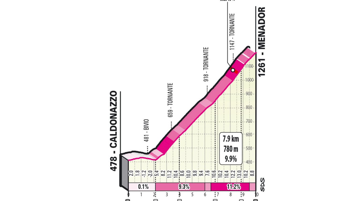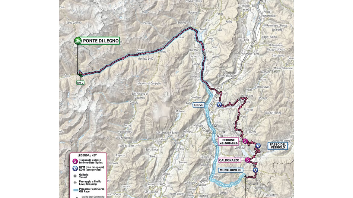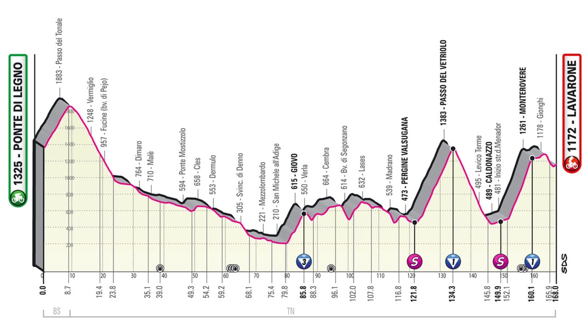 Tappa di montagna divisa in due parti. Partenza all’insù verso il Passo del Tonale seguita da un tratto di oltre 70 km sempre sostanzialmente in discesa. Dopo l’attraversamento dell’Adige si scala la salita di Palù di Giovo (feudo dei Moser), passando dalla Valle dei Mocheni per raggiungere Pergine Valsugana e il finale che da solo merita tutte le stellette di difficoltà della tappa. Dopo Pergine si scala il Passo del Vetriolo da un versante inedito e la salita del Menador con i suoi tornanti stretti e le gallerie tipiche delle strade intagliate nella roccia per ragioni belliche (si chiamava Kaiserjägerweg). Scollinato il GPM di Monte Rovere pochissimi chilometri ondulati porteranno un gruppetto molto ridotto all’arrivo.
