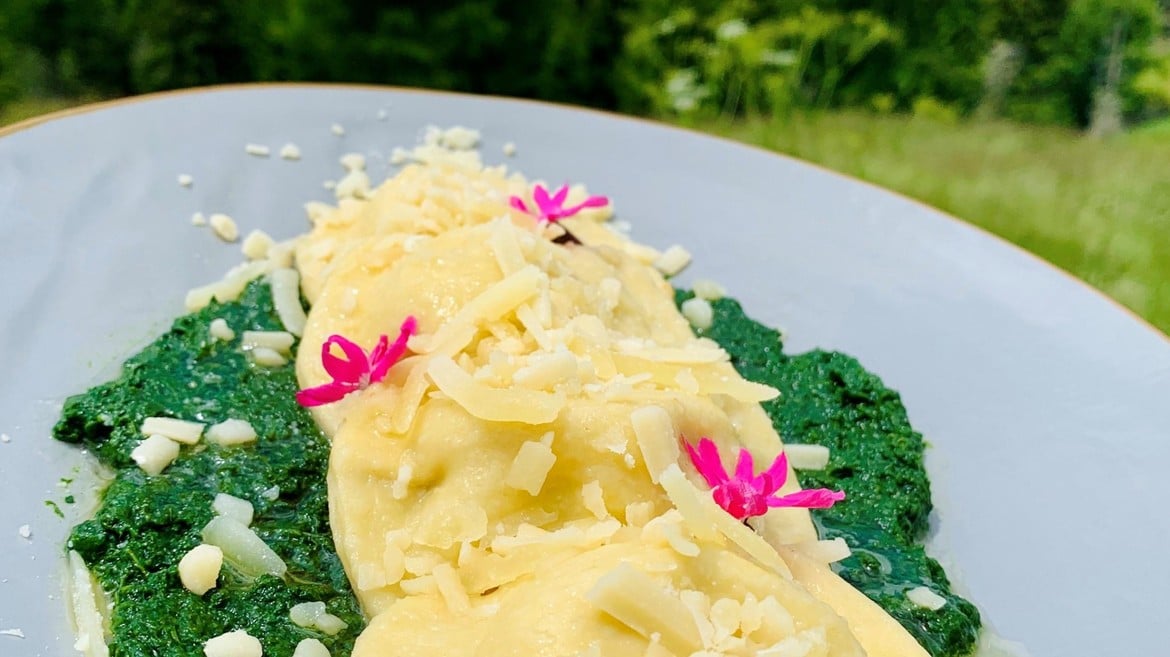 Ravioli caserecci all'emulsione di latte e olio evo del garda su crema di ortiche selvatiche e sambuco con scaglie di Vézzena vecchio di malga.
