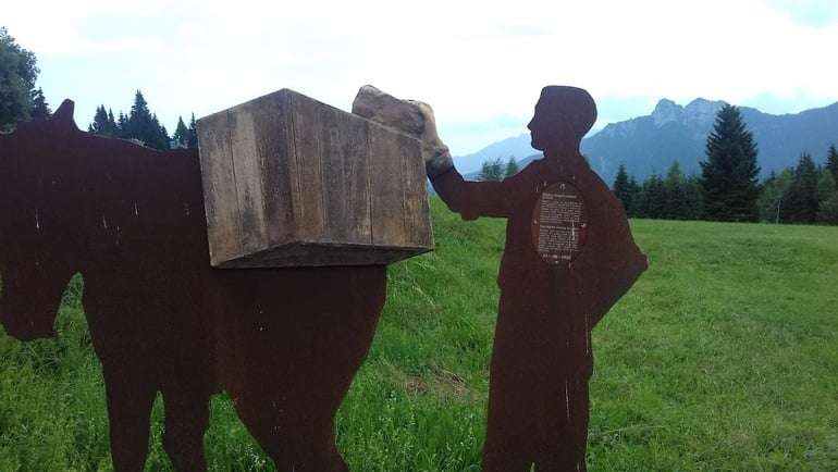 Dopo pochi passi, all'angolo della Casa Museo Cimbra, troviamo la seconda statua, Annemarie, che ci segnala il sentiero da prendere. A questo punto ci lasciamo il paese alle spalle percorrendo un cammino circondato da campi e prati.