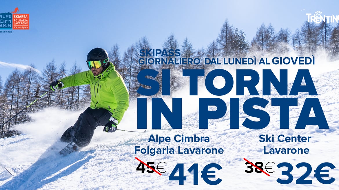 Acquista online il tuo skipass giornaliero per sciare su oltre 100km di piste della Skiarea Alpe Cimbra