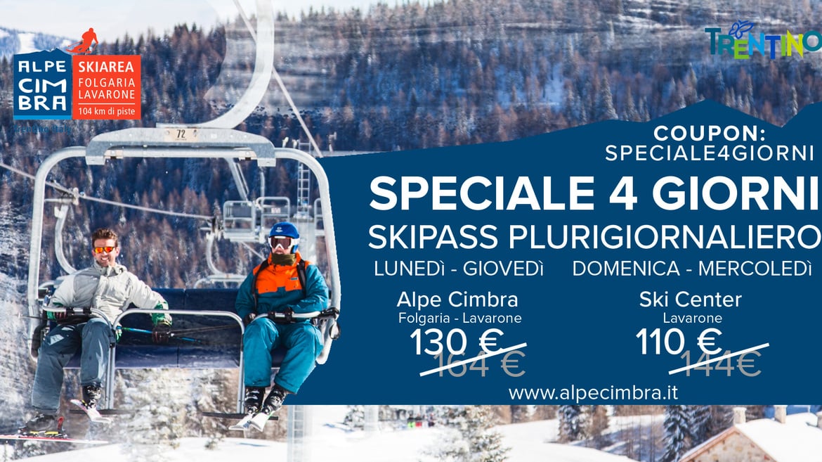 Valido per 4 giorni consecutivi da domenica a mercoledì o da lunedì a giovedì nei comprensori di Folgaria Lavarone e Fiorentini