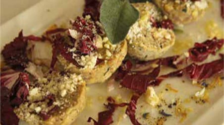 Tagliare il pane raffermo a piccoli cubetti e metterlo in ammollo in latte leggermente tiepido per circa due ore. Tagliare a piccoli dadini la Luganega del Trentino e lo Speck del Trentino. Unire i salumi al pane, aggiungendo prezzemolo cipolla e aglio tritati. Insaporire con sale, pepe e quindi aggiungere le uova. Amalgamate il tutto con le mani, spolverando con la farina bianca e modellando l’impasto in piccole polpette. Cuocere a fuoco lento nel brodo di carne per circa 15 minuti. Se l’impasto è stato preparato correttamente i canederli rimangono compatti e non si sfaldano. Scottare i canederli con burro fuso e salvia aggiungendo per ultimo il radicchio.