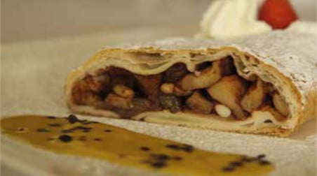 Mondare le mele e tagliarle a dadini di 2 cm circa, aggiungere lo zucchero la cannella i pinoli e l’uvetta, bagnare con la grappa e far riposare per 15 minuti. Stendere la sfoglia, posare il composto di mele orizzontalmente e arrotolare. Bucherellate la sfoglia, spennellate dell’uovo e infornate a 200 gradi per 20 minuti circa.