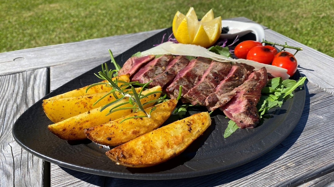 Tagliata di Black Angus con rucola, Vézzena vecchio e patate arrosto