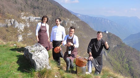 I suoi piatti sono un viaggio di scoperta dei prodotti tipici dell’Alpe Cimbra, un'esperienza di sapori e profumi davvero interessante. Le cose da assaggiare sarebbero tantissime. Si può incominciare con gnocchetti di ricotta del Maso Guez, a seguire un assaggio di Carbonara cimbra del John. Poi Uovo Arcobaleno del Maso Guez con rape rosse cotte nella sabbia Dolomia, cialda croccante e Trentingrana. Infine si può degustare una Tartelletta di baccalà mantecato. Per finire in bellezza un sorbetto e dolcetti al cioccolato. Il tutto da assaporare con equilibrati abbinamenti di vino e birra proposti da Fabrizio Franzoi, direttore di sala e sommelier.