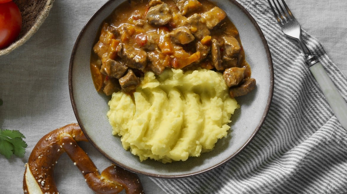 Morbida polenta di patate, preparata secondo la ricetta tipica trentina, servita con un gustoso spezzatino di carne cotto lentamente