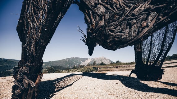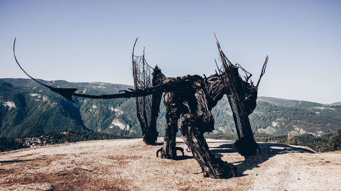 Creata con maestria dall'artista Marco Martalar, questa scultura è composta da oltre 3000 pezzi di radici di alberi abbattuti dalla tempesta Vaia e più di 3000 viti.