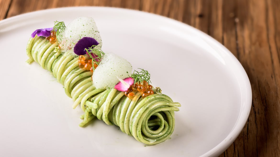 Il grano duro che regala vigore ad un pesto di germogli d'abete accompagnato dalla delicatezza del salmerino e dalla spiccata sapidità delle uova di trota.