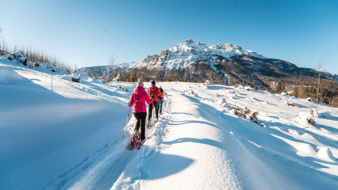Il solo rumore delle ciaspole che calpestano il manto nevoso immacolato infrange il silenzio.