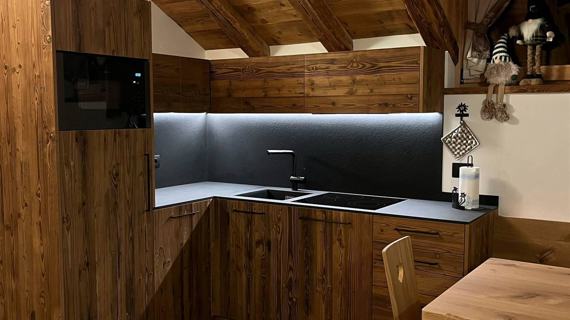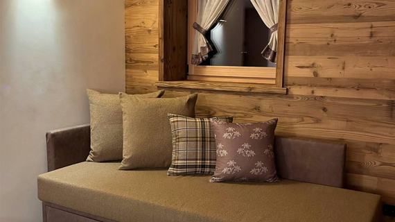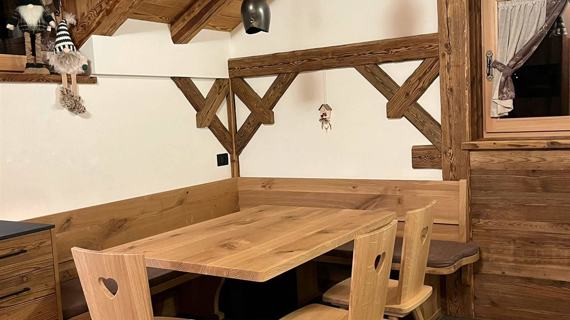 A larch wood staircase leads to the upper floor, which features an open-space area with a fully equipped kitchen (microwave oven, induction cooktop with suitable pots, dishwasher, fridge, small freezer, plates and utensils, hand blender, moka coffee pot, placemats, and tablecloth), a wooden oak table with bench seating and chairs, and a comfortable sofa. The entire cabin is heated with underfloor heating.