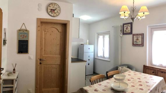 Apartment for rent in Serrada di Folgaria in Trentino, about 40sqm on the first floor. It features a carefully furnished kitchen equipped with an oven, fridge, and stove. One triple room. Windowed bathroom with shower. Common use washing machine available. Ski storage and parking space.